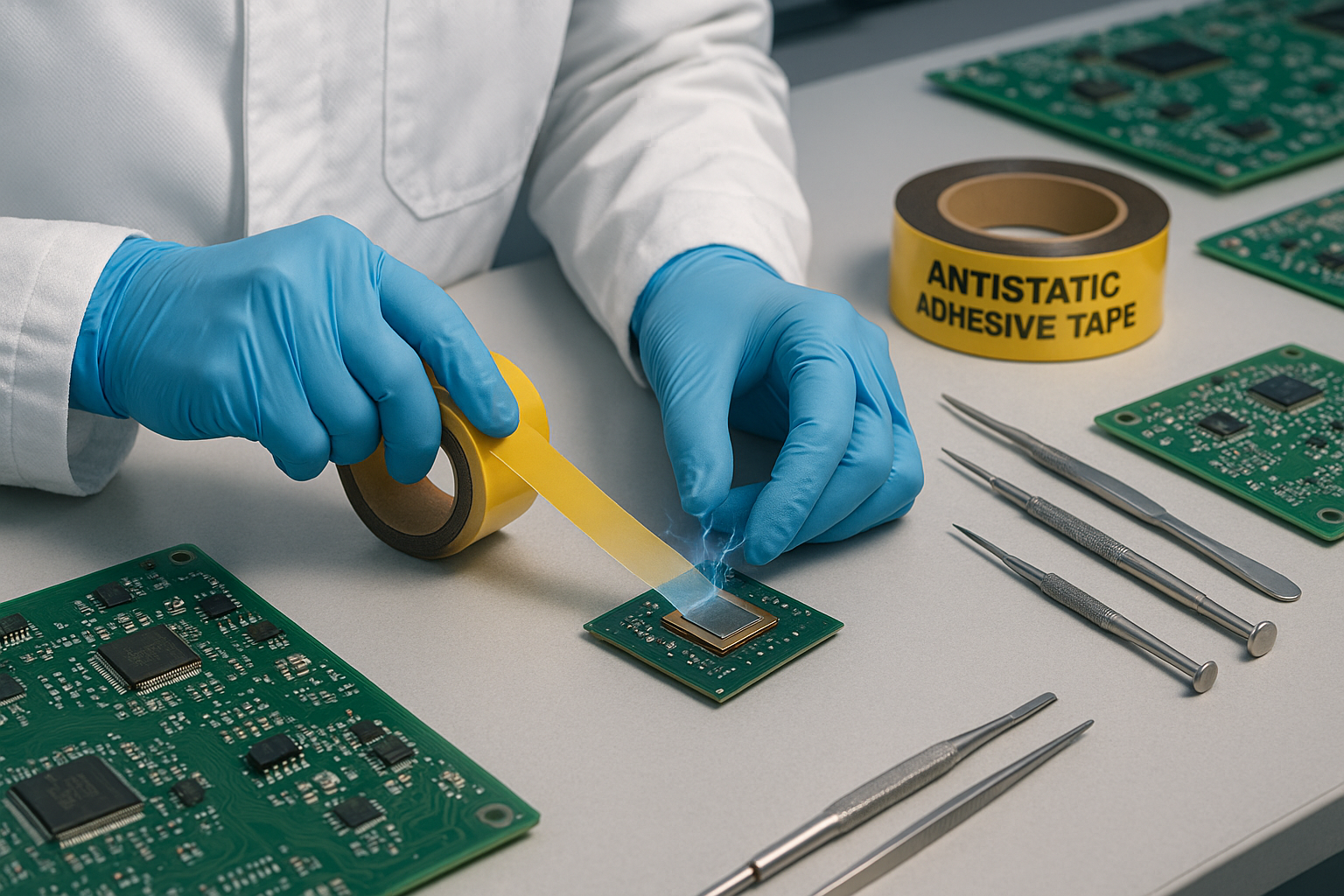 Montering av trykte kretskort (PCB) og håndtering av halvlederkomponenter er blant de høyest prioriterte brukstilfellene for antistatiske bånd. I pick-and-place-operasjoner kan tapematere og bærebånd som samler opp ladning føre feil eller tiltrekke seg forurensninger; i reflow- og bølgeloddemiljøer kan ladede partikler forårsake loddefeil. Bruk av tape med kontrollert overflateresistivitet bidrar til å opprettholde ESD-sikre prosessvinduer og minimerer monteringsfeil forårsaket av elektrostatiske hendelser.