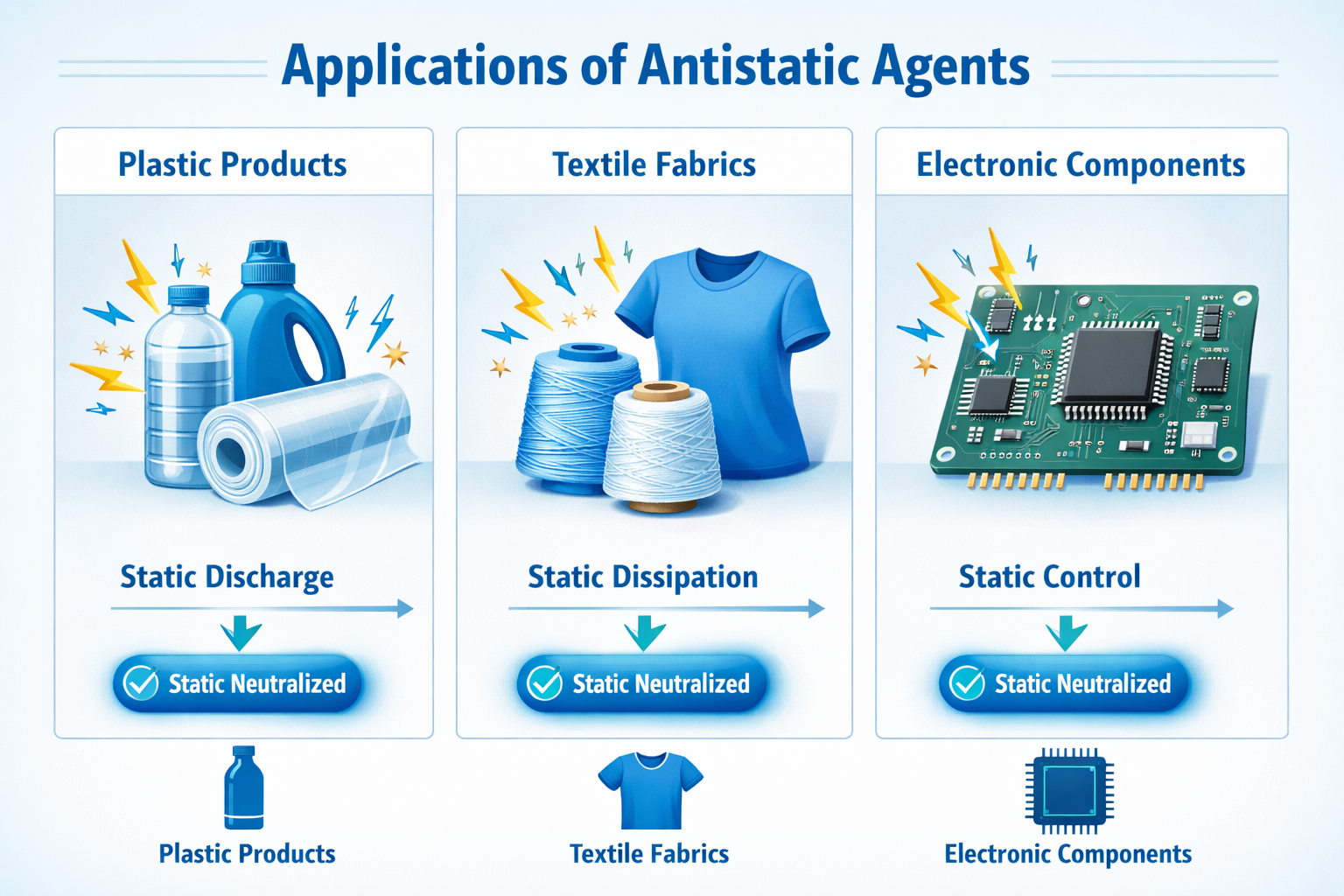 Antistatiske midler er kjemiske forbindelser designet for å redusere eller eliminere akkumulering av statisk elektrisitet på overflaten av materialer. I industrielle applikasjoner kan statisk ladning føre til støvtiltrekning, materiale som fester seg, gnistdannelse eller til og med feil på elektroniske komponenter. Antistatiske midler fungerer ved enten å øke overflatens ledningsevne eller tiltrekke fuktighet for å spre ladninger, noe som gjør dem essensielle for plast, tekstiler og elektronikk.